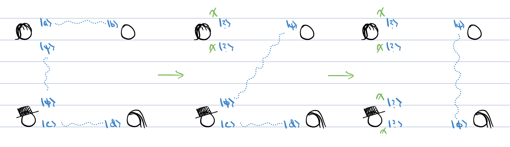 Notice that in the quantum teleportation scheme, we didn’t prohibit the target qubit from being entangled itself. If we teleport that qubit, then the entanglement will be “swapped” to the qubit at the destination. I’ve drawn a few illustrations to demonstrate this concept. First, here’s an illustration of how the conventional quantum teleportation circuit operates: