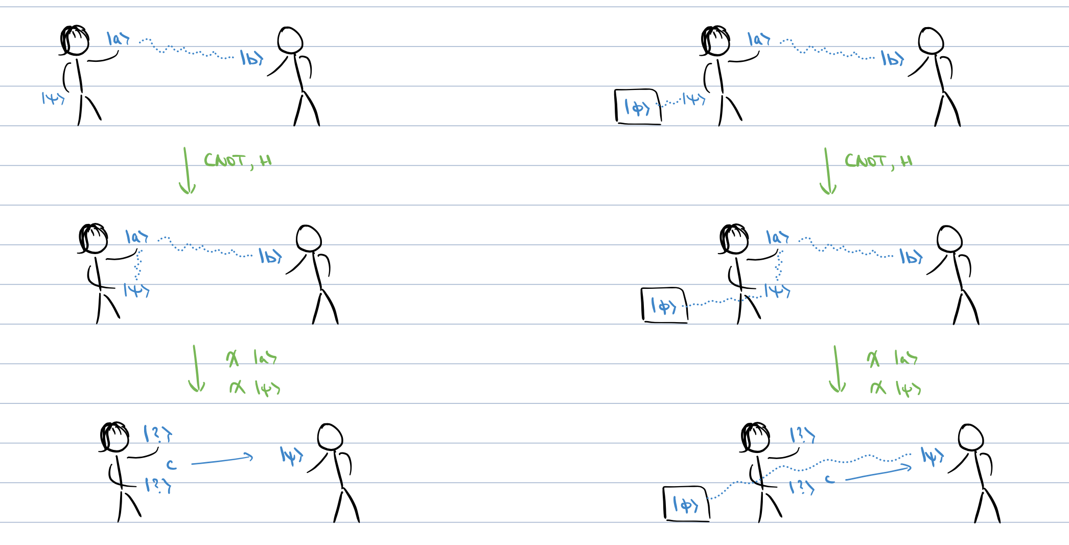 The left side depicts the simple case. Alice and Bob share an entangled pair a and b, corresponding to their names. After the CNOT and Hadamard gates, Alice entangles her target qubit ψ with a. Finally, after she measures her qubits, she knows which classical bit c to send to Bob so that he can transform his qubit into ψ.